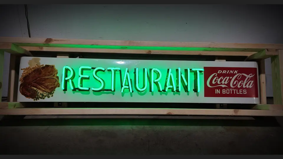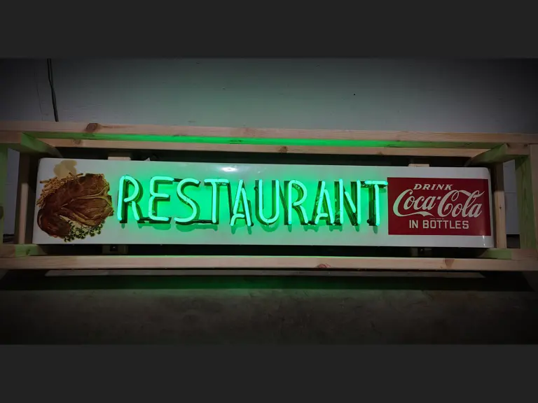 This sign features new neon glass, transformers and GTO wiring. It is on a die cut metal can with hanging brackets. Crated for transportation.