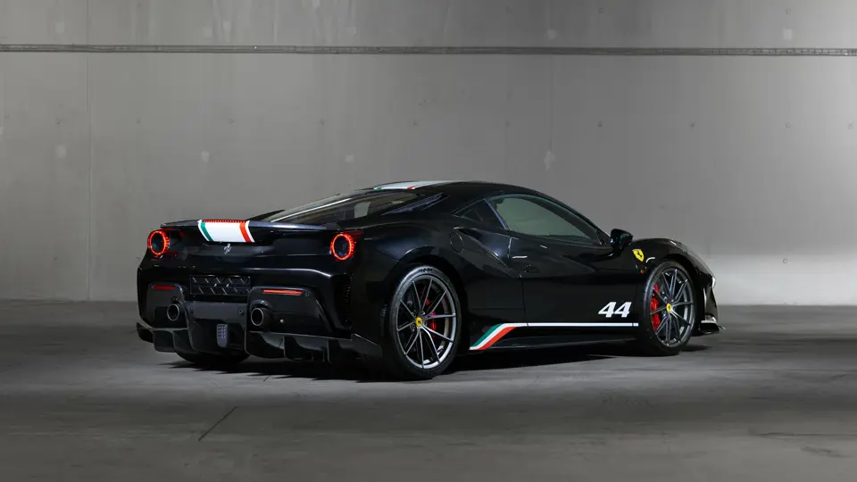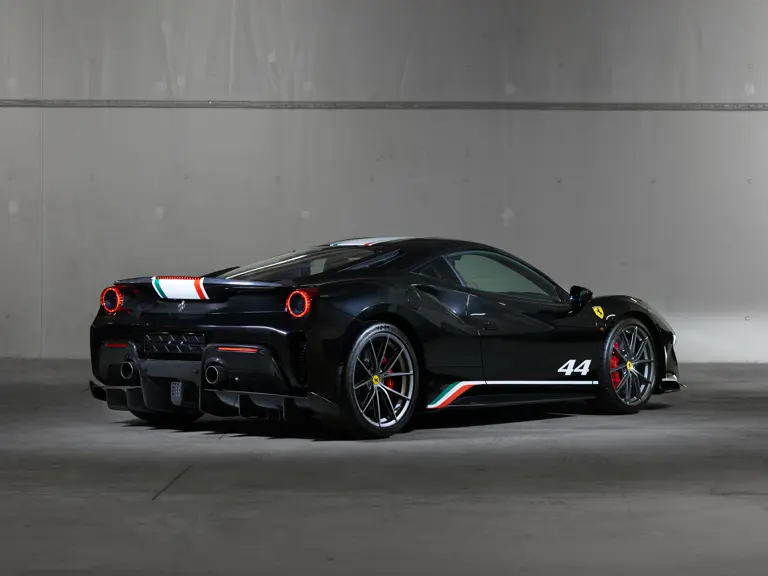 This 488 Pista ‘Piloti Ferrari’ was delivered new in October 2019 by Scuderia Gohm of Vösendorf, Austria. Finished in Nero Daytona with Tricolore accents and the race number "44" (as used in Formula 1 by Lewis Hamilton), the car’s specification is completed by an Alcantara Nera interior. It returned to Gohm Singen, a Germany-based Ferrari dealer near the Swiss border, for annual servicing every year until 2023. The most recent documented service was completed by Niki Hasler AG of Basel, Switzerland in May 2025.